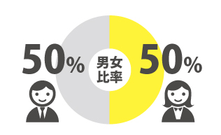 男女比はハーフ&ハーフです。沖縄県で女性の正社員雇用の割合が50%以上の企業は約3割です。育児休業制度や育休明けの短時間勤務、急な休みに対応できるフォロー体制があることも、女性が長く働ける理由の一つかもしれません。男女問わず、子育てしながら働ける「ライフワークバランス」がとれる職場環境があります。